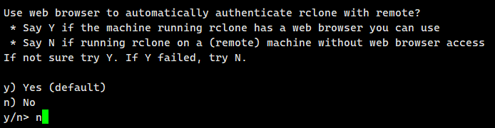 10)然后Reclone会进行一个是否有浏览器的询问,由于大部分的Linux服务器都没有GUI,所以无法使用浏览器,此时我们需要输入 n ,使用本地电脑辅助授权